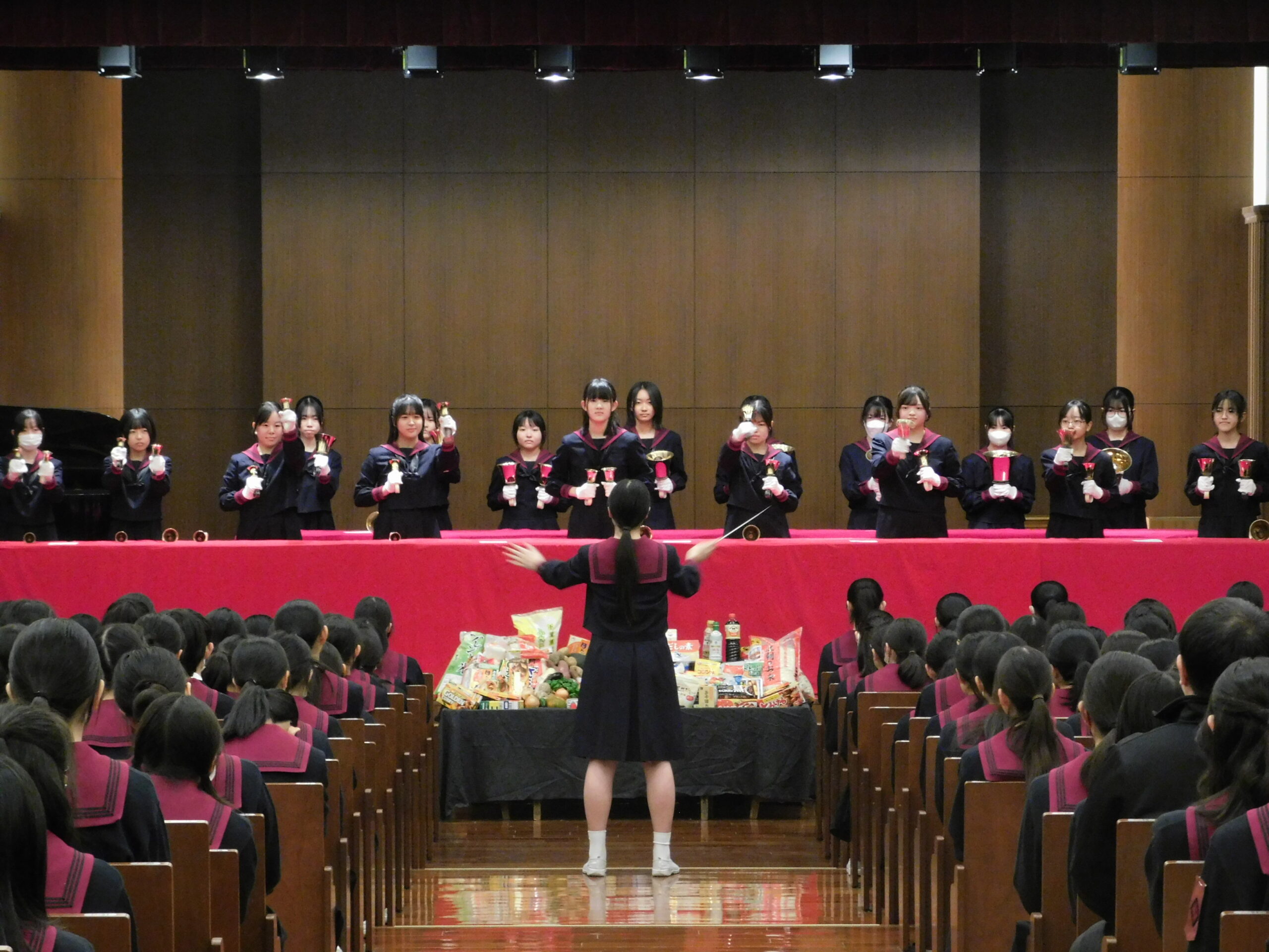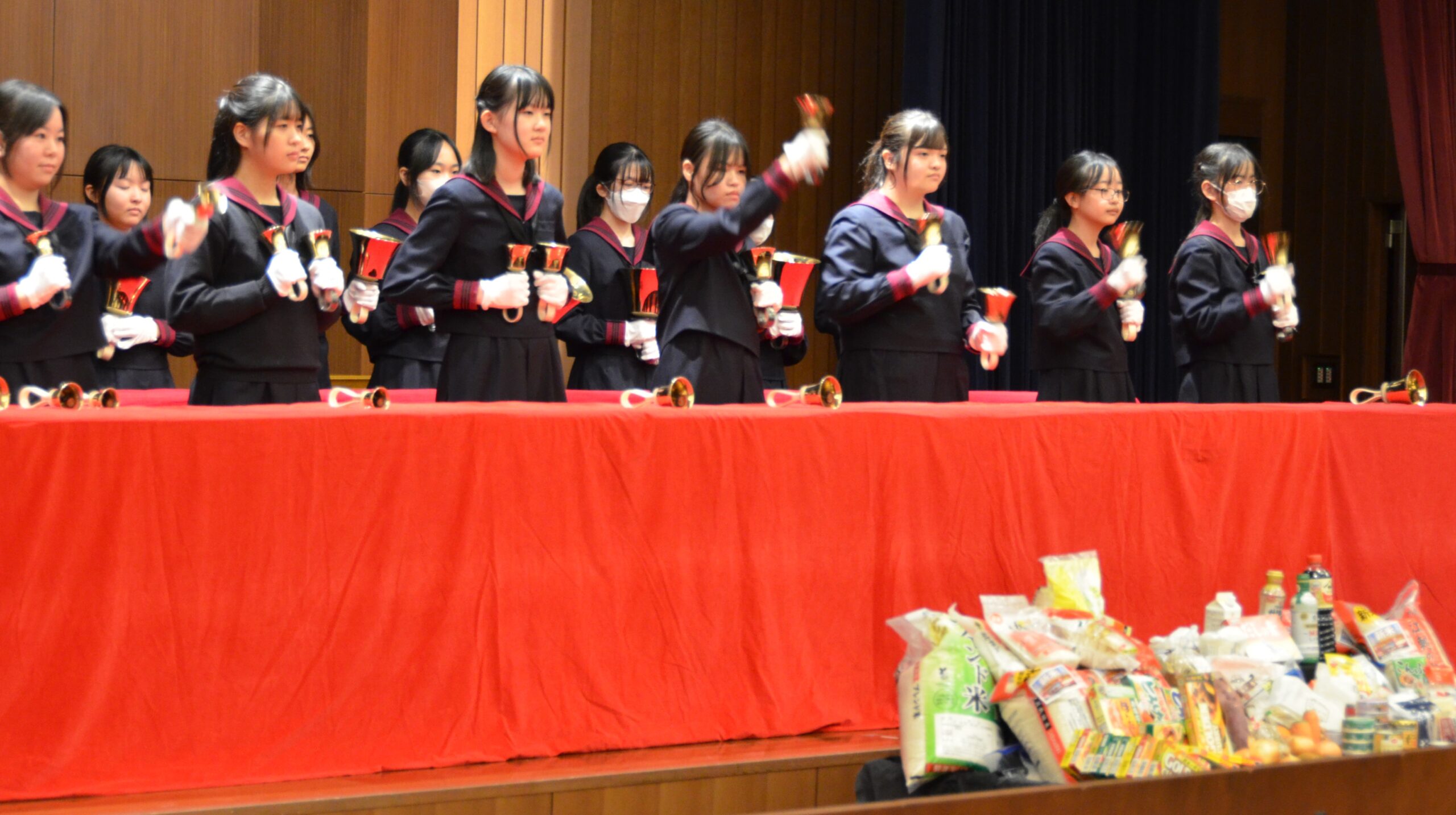 学園では、生徒たちが家庭から野菜、お米、調味料などを持ち寄って、ハンドベルクワイヤーによる収穫感謝讃美礼拝をまもりました。