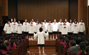 メッセージの後、全校生徒と共に賛美する気持ちで力強い歌声を聴きました。