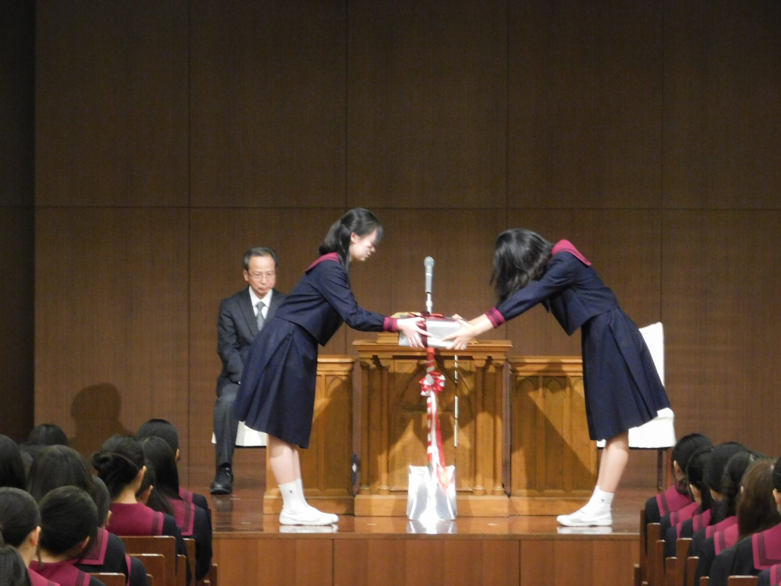最後に、生徒会より卒業生へ記念品の贈呈が行われました。