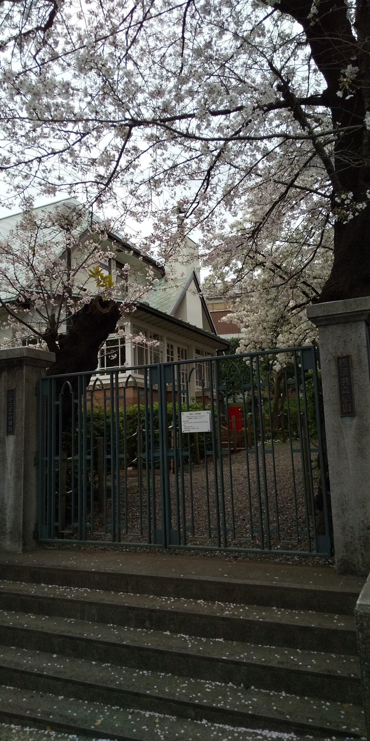 今年の桜は早く、214番館も校庭の桜も花吹雪です。