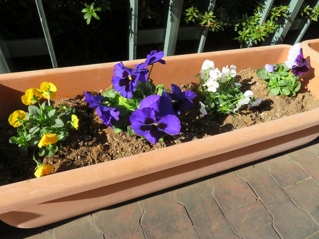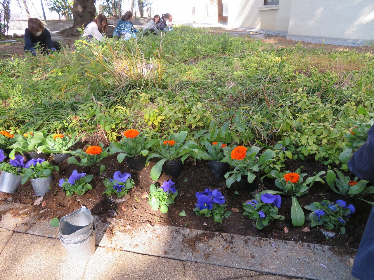 中学生通路のプランターは、カラフルな色のパンジー・ビオラで明るいイメージに、また、南校舎アプローチは、花壇に沿って青色のパンジー・オレンジ色のキンセンカで落ち着いたイメージに仕上げました。